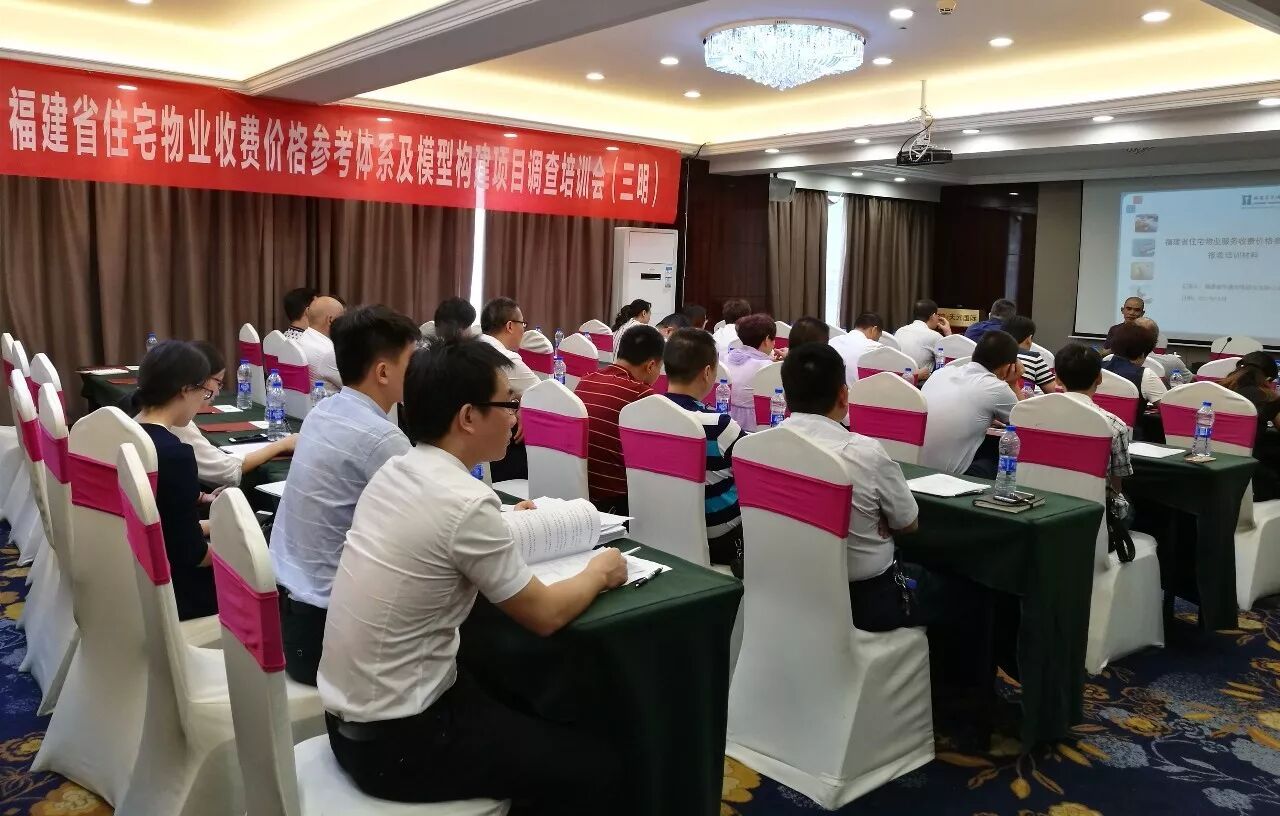 2017年10月13日下午,福建省住宅物业收费价格参考体系及模型构建项目调查培训会(三明)在三明市天元国际酒店13楼会议室举行。福建省物业管理协会会长赵峥、三明市住房和城乡建设局房地产业科科长林彬、三明市物业管理行业协会会长王宏、秘书长雷贤伟、福建省华通市场调查有限公司董事长徐积璋以及来自三明各市县的物业企业代表共40余人出席了会议。